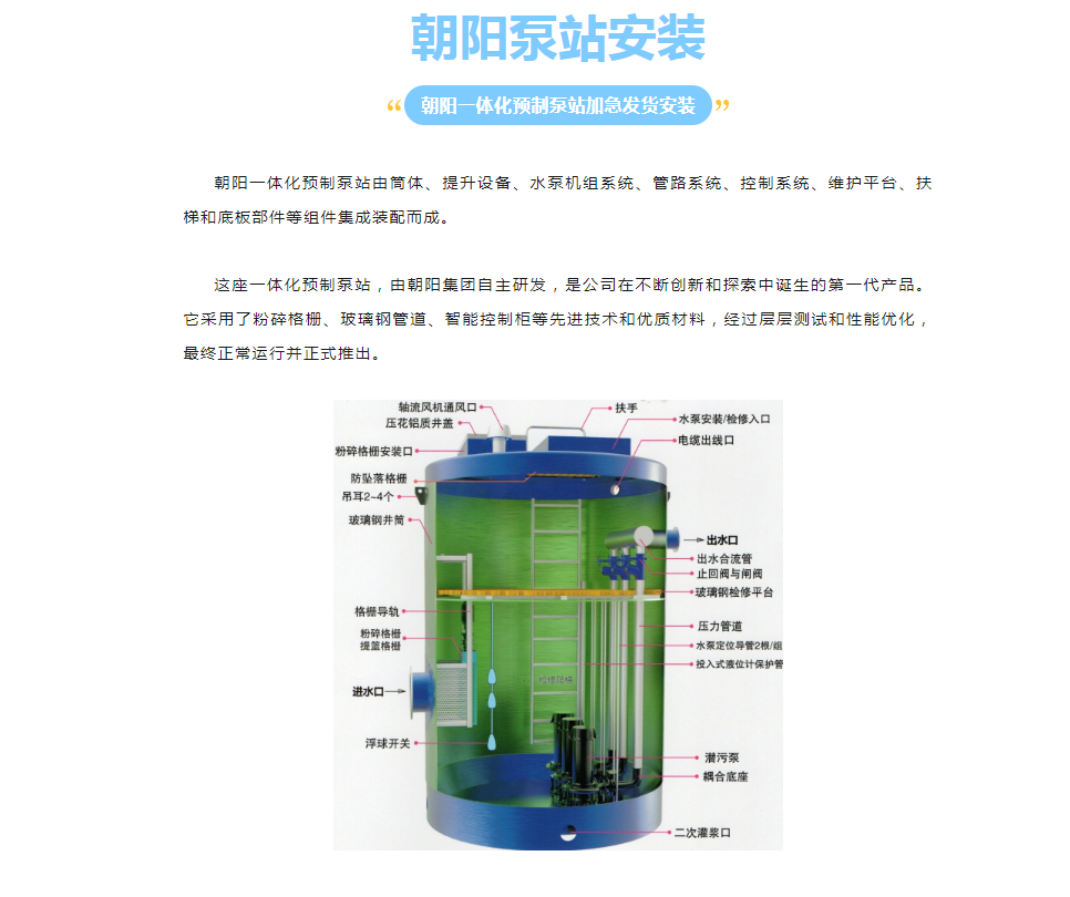 朝陽(yáng)集團(tuán)應(yīng)工業(yè)園客戶的具體需求,按時(shí)按需完成并發(fā)貨。定制的一體化預(yù)制泵站,在設(shè)計(jì)上充分考慮了客戶的實(shí)際使用情況,經(jīng)過嚴(yán)格測(cè)試和檢驗(yàn),確保其性能穩(wěn)定可靠,壽命長(zhǎng)久。